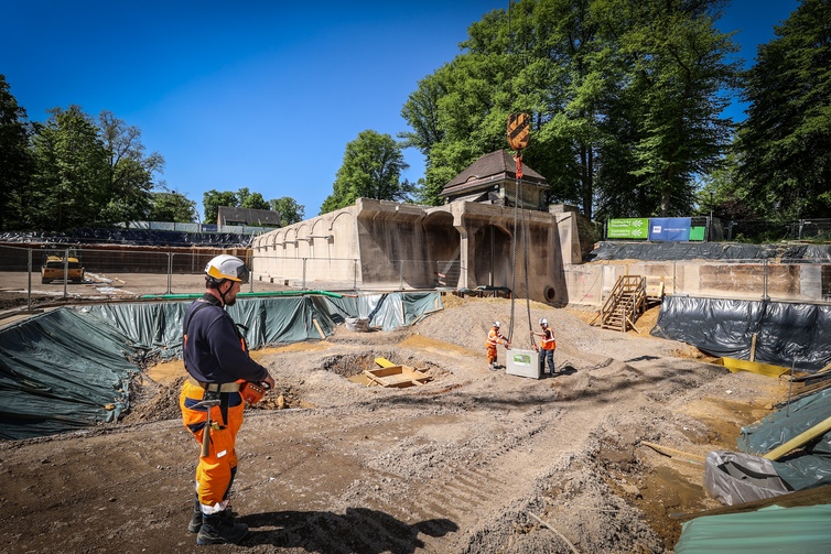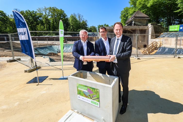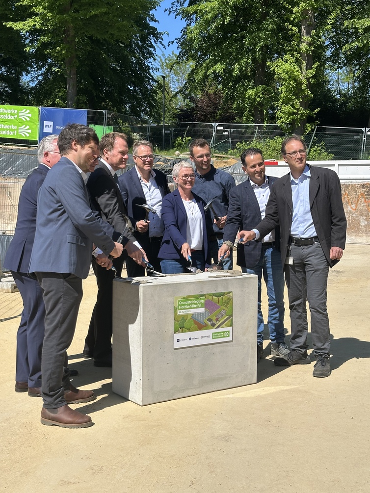 Nach dem Rückbau des alten Speichers wurde nun feierlich der Grundstein für den neuen Hochbehälter gelegt - begleitet von einer Zeremonie samt Zeitkapsel, bei der auch Oberbürgermeister Dr. Stephan Keller und Vorstandsvorsitzender der Stadtwerke, Julien Mounier, dabei waren. Der neue Speicher wird über ein Fassungsvermögen von 10.000 Kubikmetern verfügen. Die Inbetriebnahme ist für das Jahr 2029 geplant.